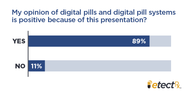 During the discussion, etectRx polled the audience, concluding that 89% of participants said their opinions of digital pills and digital pill systems was positive because of the presentation. The majority of listeners saw digital pill systems positively in real and current time.