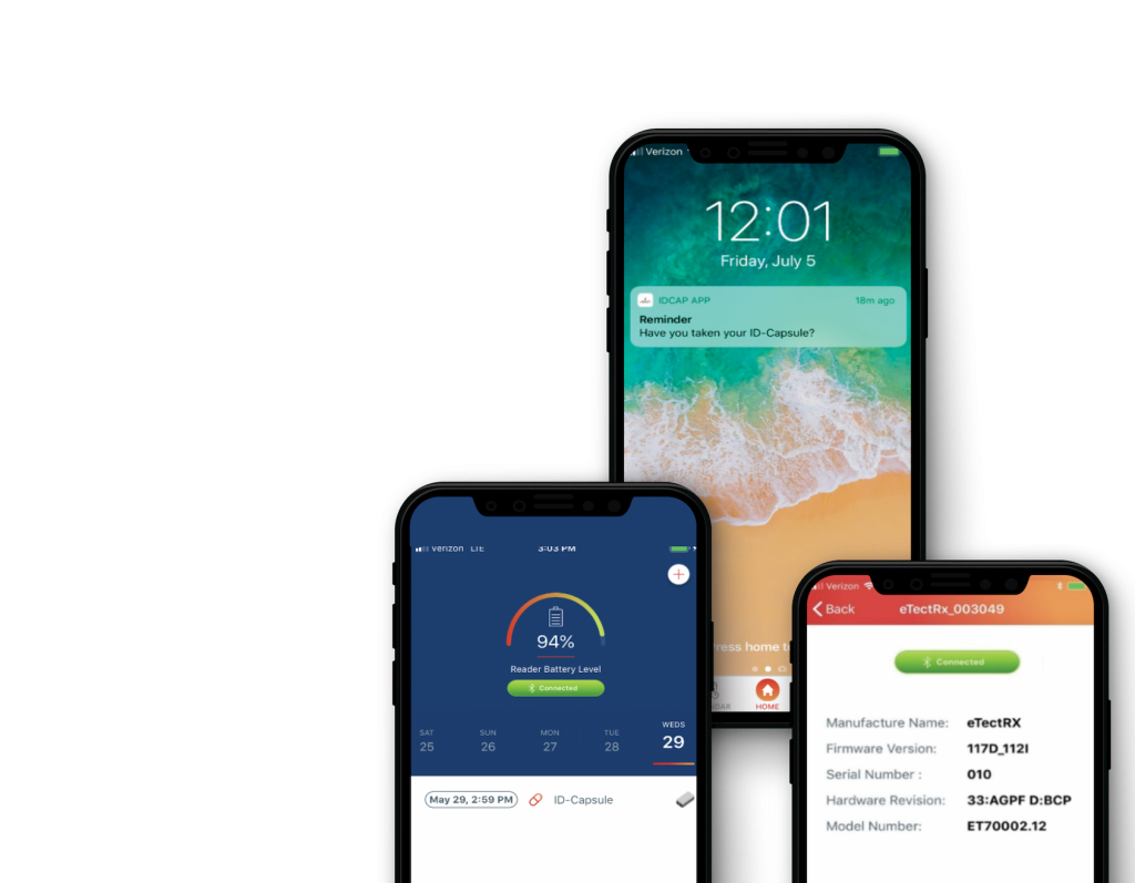 The ID-Cap App relays the messages received by the Reader to the cloud-based secure server. It allows patients to view ingestion events as they occur and displays ingestion event history.